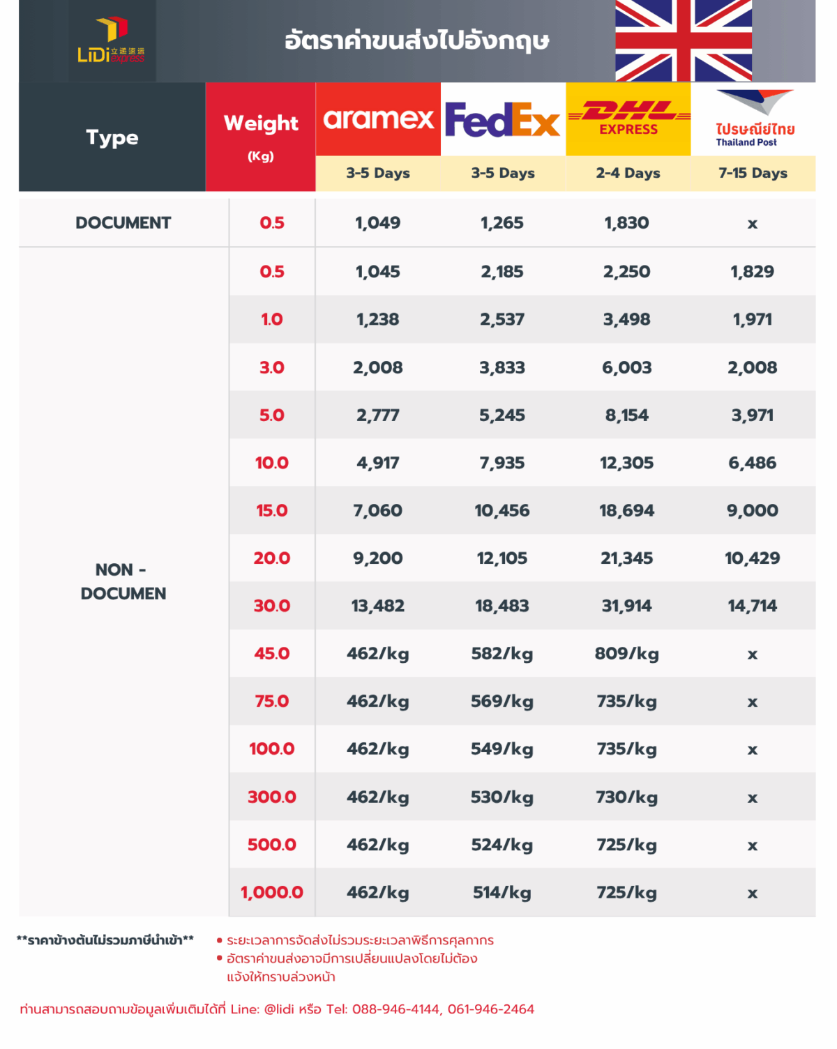 LIDI express บริการขนส่งสินค้า ของ พัสดุ eCommerce เอกสารด่วนไป สหราชอาณาจักร (UK)